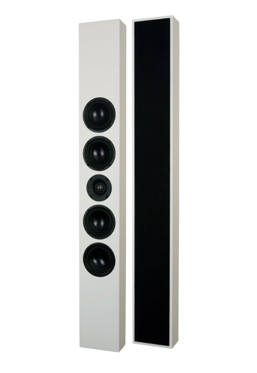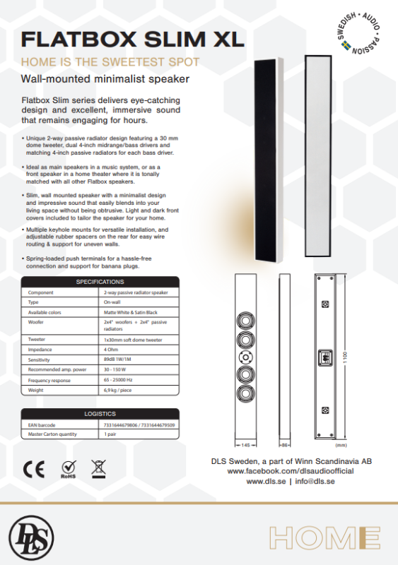 DLS Flatbox Slim XL är en vägghängd högtalare - och storebror till Flatbox Midi - i härlig mattvit finish och ett förbluffande stort ljud. Elementbestyckningen är näst intill densamma som Flatbox XL, men här har vardera baselement fått en varsin slavbas. "Slim" indikerar också att kabinettet är smalare och mer avlångt. Svenskarna har med sin Flatbox-serie skördat stor framgång, även exportmässigt och det är lätt att förstå med tanke på det varma, detaljerade och fylliga ljudet. Passar lika bra till musiken som för front- eller surroundkanalerna i en bio-setup. Högtalarna tar minimalt med plats i hemmet - tur att ljudet inte är lika blygsamt!