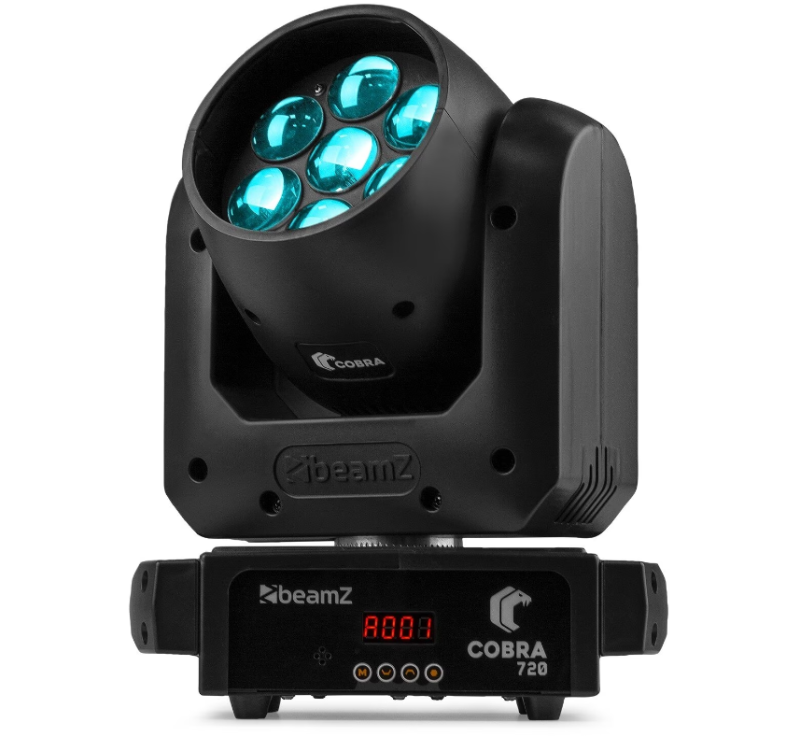 Cobra 720 rörligt huvud med zoom från det välkända märket beamZ är ett kompakt rörligt huvud med exceptionell prestanda. Cobra 720 är mycket lämplig för nattklubbar, kaféer och på språng. De 7 RGBW lysdioderna på 20 watt ger en verkligt imponerande ljuseffekt. Tack vare funktioner som linjär elektronisk zoom och elektronisk dimmer kan du skapa en bländande ljusshow för alla evenemang.