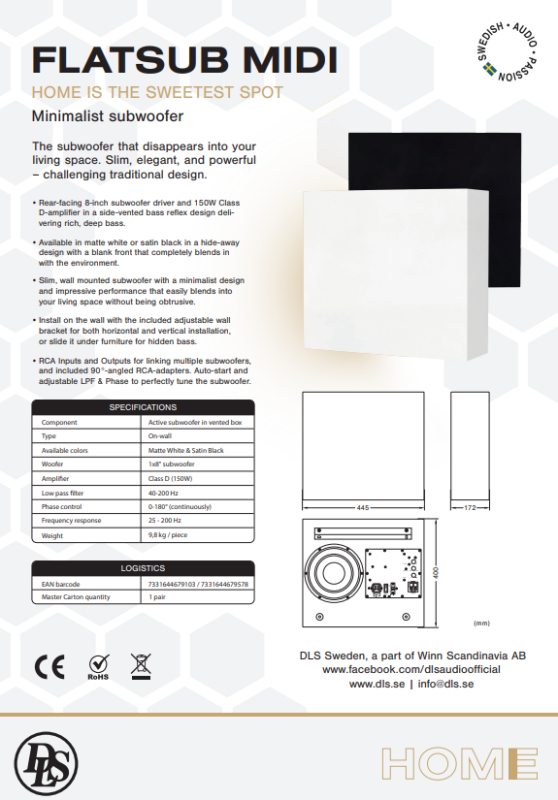 Tillsammans med DLS´s egna Flatbox-modeller skapar de tillsammans en perfekt symmetri i design, men givetvis passar Flatsub Midi lika bra till alla övriga fabrikats högtalarmodeller.