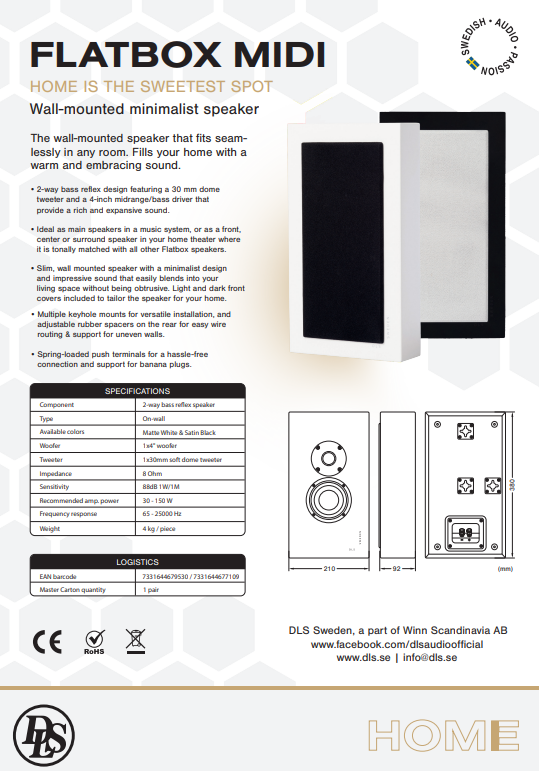 Svenska DLS har med sin Flatbox-serie skördat stora framgångar och Flatbox Midi är storebror till Mini, här med ett större diskantmembran och en rejälare 4" mellanregister/baselement. Detta ger en högre upplösning och kropp till ljudet. Precis som övriga medlemmar tar den här högtalaren minimalt med plats i ditt hem, men dess ljud kommer dra på dina smilband!