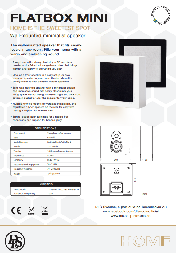 Vägghängt ljud i världsklass Vill du ha ett par Flatbox för musiken eller fem högtalare till hemmabion? Föreställ dig med en inre bild hur de stora och platskrävande golvhögtalarna är borta, och hur stilrent och mycket trevligare vardagsrummets dimensioner kan bli genom att få upp högtalarna på väggen. Svenska DLS har med sin Flatbox-serie tagit ett stadigt grepp om marknaden för denna stadigt växande typ av högtalare för det moderna hemmet. Genom flera nyckelhål på baksidan kan högtalaren monteras både vertikalt eller horisontellt, beroende på bruk eller installation. Flatbox tillverkas i mattvit eller mattsvart finish. En glädjande finess är att DLS generöst har valt att leverera Flatbox med både gråvita och svarta gallerfronter, något som både kan ge fina kontraster eller bryta av på rätt sätt beroende på dess omgivning. Anledningen till valet av gråvitt tyg, och inte helvitt, är att lättare dölja smutsavtryck eller dammringar runt elementen. DLS har verkligen tänkt igenom allt med Flatbox! En ny och fräschare design Dagens Flatbox-modeller har - utöver förbättrade ljudegenskaper - fått en del kosmetiska detaljer förändrade, som de gemensamt delar. Kabinettets kanter har fått en större rundning och tygfronterna har fått avfasade kortsidor. Basporten på sidan är slitsad istället för att ha en trattformad öppning, något som gör att högtalaren kan hantera mer luftflöde utan att skapa blåsljud. "DLS Sweden" är printat på kabinettets front i hörnet. Anslutningen har blivit smidigare med tryckkontakter, som kan hantera bananpluggar, och kabinettets baksida har mjuka och gängade gummifötter som ger plats för högtalarkabeln baktill och även kan kompensera för en inte helt jämn vägg. Fint ljud på väggen kräver omtanke Även om en DLS Flatbox-högtalare är platt i formen, så är dess ljud det motsatta. DLS har vid utvecklingen tagit hänsyn till de akustiska fenomen som en högtalare oftast möter vid en väggplacering, något som normalt sett inte är helt optimalt. men genom beräknar av frekvenskurvan så blir ljudet inte är närheten lika basbumligt och platt som man först tror. För att citera magasinet Hifi&Musik när de testade Flatbox XL: "Ljudbilden blir långt ifrån något platt fall".