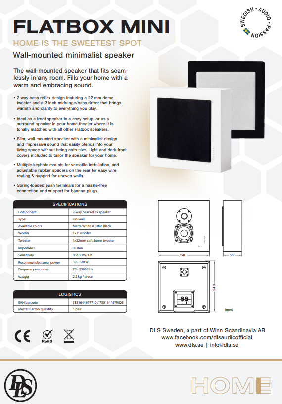 Vägghängt ljud i världsklass Vill du ha ett par Flatbox för musiken eller fem högtalare till hemmabion? Föreställ dig med en inre bild hur de stora och platskrävande golvhögtalarna är borta, och hur stilrent och mycket trevligare vardagsrummets dimensioner kan bli genom att få upp högtalarna på väggen. Svenska DLS har med sin Flatbox-serie tagit ett stadigt grepp om marknaden för denna stadigt växande typ av högtalare för det moderna hemmet. Genom flera nyckelhål på baksidan kan högtalaren monteras både vertikalt eller horisontellt, beroende på bruk eller installation. Flatbox tillverkas i mattvit eller mattsvart finish. En glädjande finess är att DLS generöst har valt att leverera Flatbox med både gråvita och svarta gallerfronter, något som både kan ge fina kontraster eller bryta av på rätt sätt beroende på dess omgivning. Anledningen till valet av gråvitt tyg, och inte helvitt, är att lättare dölja smutsavtryck eller dammringar runt elementen. DLS har verkligen tänkt igenom allt med Flatbox! En ny och fräschare design Dagens Flatbox-modeller har - utöver förbättrade ljudegenskaper - fått en del kosmetiska detaljer förändrade, som de gemensamt delar. Kabinettets kanter har fått en större rundning och tygfronterna har fått avfasade kortsidor. Basporten på sidan är slitsad istället för att ha en trattformad öppning, något som gör att högtalaren kan hantera mer luftflöde utan att skapa blåsljud. "DLS Sweden" är printat på kabinettets front i hörnet. Anslutningen har blivit smidigare med tryckkontakter, som kan hantera bananpluggar, och kabinettets baksida har mjuka och gängade gummifötter som ger plats för högtalarkabeln baktill och även kan kompensera för en inte helt jämn vägg. Fint ljud på väggen kräver omtanke Även om en DLS Flatbox-högtalare är platt i formen, så är dess ljud det motsatta. DLS har vid utvecklingen tagit hänsyn till de akustiska fenomen som en högtalare oftast möter vid en väggplacering, något som normalt sett inte är helt optimalt. men genom beräknar av frekvenskurvan så blir ljudet inte är närheten lika basbumligt och platt som man först tror. För att citera magasinet Hifi&Musik när de testade Flatbox XL: "Ljudbilden blir långt ifrån något platt fall".
