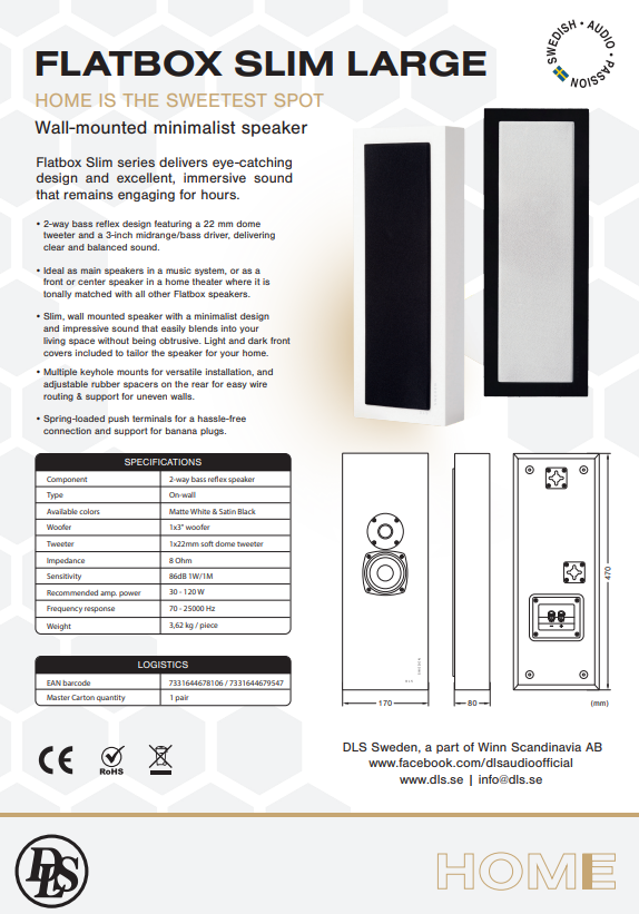 DLS Flatbox - högtalarna med den skyhöga WAF-faktorn Vill du ha ett par Flatbox för musiken eller fem högtalare till hemmabion? Föreställ dig med en inre bild hur de stora och platskrävande golvhögtalarna är borta, och hur stilrent och mycket trevligare vardagsrummets dimensioner kan bli genom att få upp högtalarna på väggen. Svenska DLS har med sin Flatbox-serie tagit ett stadigt grepp om marknaden för denna stadigt växande typ av högtalare för det moderna hemmet. Genom flera nyckelhål på baksidan kan högtalaren monteras både vertikalt eller horisontellt, beroende på bruk eller installation. Flatbox tillverkas i mattvit finish eller mot ett pristillägg i pianolackad svart. En glädjande finess är att DLS generöst har valt att leverera Flatbox med både gråvita och svarta gallerfronter, något som både kan ge fina kontraster eller bryta av på rätt sätt beroende på dess omgivning. Anledningen till valet av gråvitt tyg, och inte helvitt, är att lättare dölja smutsavtryck eller dammringar runt elementen. DLS har verkligen tänkt igenom allt med Flatbox! En ny och fräschare design Dagens Flatbox-modeller har - utöver förbättrade ljudegenskaper - fått en del kosmetiska detaljer förändrade, som de gemensamt delar. Kabinettets kanter har fått en större rundning och tygfronterna har fått avfasade kortsidor. Basporten på sidan är slitsad istället för att ha en trattformad öppning, något som gör att högtalaren kan hantera mer luftflöde utan att skapa blåsljud. "DLS Sweden" är printat på kabinettets front i hörnet. Anslutningen har blivit smidigare med tryckkontakter, som kan hantera bananpluggar, och kabinettets baksida har mjuka och gängade gummifötter som ger plats för högtalarkabeln baktill och även kan kompensera för en inte helt jämn vägg. Fint ljud på väggen kräver omtanke Även om en DLS Flatbox-högtalare är platt i formen, så är dess ljud det motsatta. DLS har vid utvecklingen tagit hänsyn till de akustiska fenomen som en högtalare oftast möter vid en väggplacering, något som normalt sett inte är helt optimalt. men genom beräknar av frekvenskurvan så blir ljudet inte är närheten lika basbumligt och platt som man först tror. För att citera magasinet Hifi&Musik när de testade Flatbox XL: "Ljudbilden blir långt ifrån något platt fall".