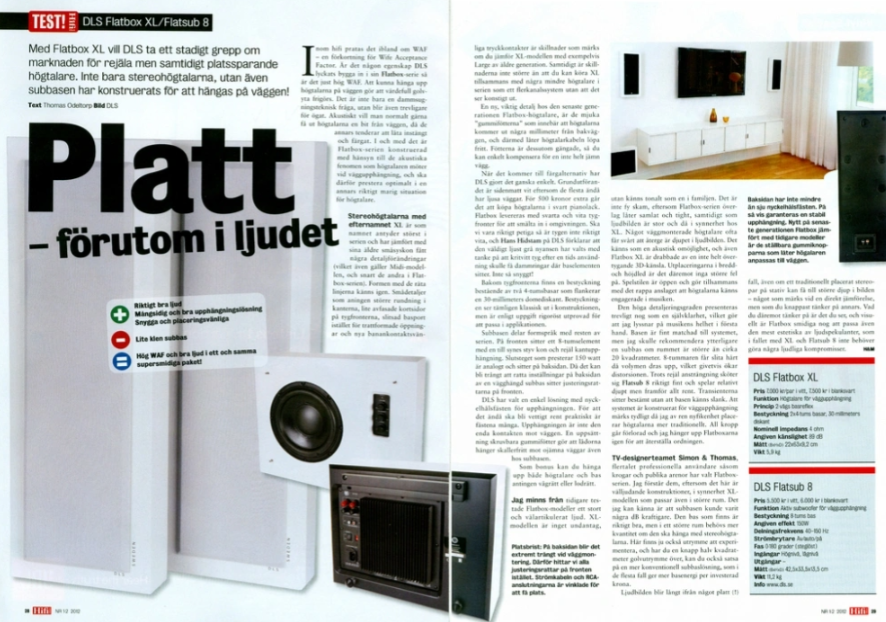 Vägghängt ljud i världsklass Vill du ha ett par Flatbox för musiken eller fem högtalare till hemmabion? Föreställ dig med en inre bild hur de stora och platskrävande golvhögtalarna är borta, och hur stilrent och mycket trevligare vardagsrummets dimensioner kan bli genom att få upp högtalarna på väggen. Svenska DLS har med sin Flatbox-serie tagit ett stadigt grepp om marknaden för denna stadigt växande typ av högtalare för det moderna hemmet. Genom flera nyckelhål på baksidan kan högtalaren monteras både vertikalt eller horisontellt, beroende på bruk eller installation. Flatbox tillverkas i mattvit finish eller mot ett pristillägg i pianolackad svart. En glädjande finess är att DLS generöst har valt att leverera Flatbox med både gråvita och svarta gallerfronter, något som både kan ge fina kontraster eller bryta av på rätt sätt beroende på dess omgivning. Anledningen till valet av gråvitt tyg, och inte helvitt, är att lättare dölja smutsavtryck eller dammringar runt elementen. DLS har verkligen tänkt igenom allt med Flatbox! En ny och fräschare design Dagens Flatbox-modeller har - utöver förbättrade ljudegenskaper - fått en del kosmetiska detaljer förändrade, som de gemensamt delar. Kabinettets kanter har fått en större rundning och tygfronterna har fått avfasade kortsidor. Basporten på sidan är slitsad istället för att ha en trattformad öppning, något som gör att högtalaren kan hantera mer luftflöde utan att skapa blåsljud. "DLS Sweden" är printat på kabinettets front i hörnet. Anslutningen har blivit smidigare med tryckkontakter, som kan hantera bananpluggar, och kabinettets baksida har mjuka och gängade gummifötter som ger plats för högtalarkabeln baktill och även kan kompensera för en inte helt jämn vägg. Fint ljud på väggen kräver omtanke Även om en DLS Flatbox-högtalare är platt i formen, så är dess ljud det motsatta. DLS har vid utvecklingen tagit hänsyn till de akustiska fenomen som en högtalare oftast möter vid en väggplacering, något som normalt sett inte är helt optimalt. men genom beräknar av frekvenskurvan så blir ljudet inte är närheten lika basbumligt och platt som man först tror. För att citera magasinet Hifi&Musik när de testade Flatbox XL: "Ljudbilden blir långt ifrån något platt fall". "DLS presenterar ett mycket nyktert ljud där fokus ligger på helheten. Ingenting tillåts sticka ut samtidigt som högtalarna spelar engagerat och underhållande. Detaljeringsgraden är hög, från den förvånansvärt djupa basåtergivningen genom rösthanteringen och upp i diskanten. + Nykter och korrekt återgivning. Lätta att möblera diskret - Mer kvalitet än kvantitet, i synnerhet basen = Det bästa allroundvalet som kombinerar kvalitet och diskret design Hemmabio med stämpeln ´Bästa köpet´