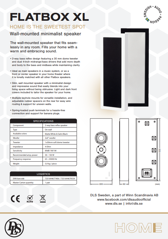 Vägghängt ljud i världsklass Vill du ha ett par Flatbox för musiken eller fem högtalare till hemmabion? Föreställ dig med en inre bild hur de stora och platskrävande golvhögtalarna är borta, och hur stilrent och mycket trevligare vardagsrummets dimensioner kan bli genom att få upp högtalarna på väggen. Svenska DLS har med sin Flatbox-serie tagit ett stadigt grepp om marknaden för denna stadigt växande typ av högtalare för det moderna hemmet. Genom flera nyckelhål på baksidan kan högtalaren monteras både vertikalt eller horisontellt, beroende på bruk eller installation. Flatbox tillverkas i mattvit finish eller mot ett pristillägg i pianolackad svart. En glädjande finess är att DLS generöst har valt att leverera Flatbox med både gråvita och svarta gallerfronter, något som både kan ge fina kontraster eller bryta av på rätt sätt beroende på dess omgivning. Anledningen till valet av gråvitt tyg, och inte helvitt, är att lättare dölja smutsavtryck eller dammringar runt elementen. DLS har verkligen tänkt igenom allt med Flatbox! En ny och fräschare design Dagens Flatbox-modeller har - utöver förbättrade ljudegenskaper - fått en del kosmetiska detaljer förändrade, som de gemensamt delar. Kabinettets kanter har fått en större rundning och tygfronterna har fått avfasade kortsidor. Basporten på sidan är slitsad istället för att ha en trattformad öppning, något som gör att högtalaren kan hantera mer luftflöde utan att skapa blåsljud. "DLS Sweden" är printat på kabinettets front i hörnet. Anslutningen har blivit smidigare med tryckkontakter, som kan hantera bananpluggar, och kabinettets baksida har mjuka och gängade gummifötter som ger plats för högtalarkabeln baktill och även kan kompensera för en inte helt jämn vägg. Fint ljud på väggen kräver omtanke Även om en DLS Flatbox-högtalare är platt i formen, så är dess ljud det motsatta. DLS har vid utvecklingen tagit hänsyn till de akustiska fenomen som en högtalare oftast möter vid en väggplacering, något som normalt sett inte är helt optimalt. men genom beräknar av frekvenskurvan så blir ljudet inte är närheten lika basbumligt och platt som man först tror. För att citera magasinet Hifi&Musik när de testade Flatbox XL: "Ljudbilden blir långt ifrån något platt fall". "DLS presenterar ett mycket nyktert ljud där fokus ligger på helheten. Ingenting tillåts sticka ut samtidigt som högtalarna spelar engagerat och underhållande. Detaljeringsgraden är hög, från den förvånansvärt djupa basåtergivningen genom rösthanteringen och upp i diskanten. + Nykter och korrekt återgivning. Lätta att möblera diskret - Mer kvalitet än kvantitet, i synnerhet basen = Det bästa allroundvalet som kombinerar kvalitet och diskret design Hemmabio med stämpeln ´Bästa köpet´