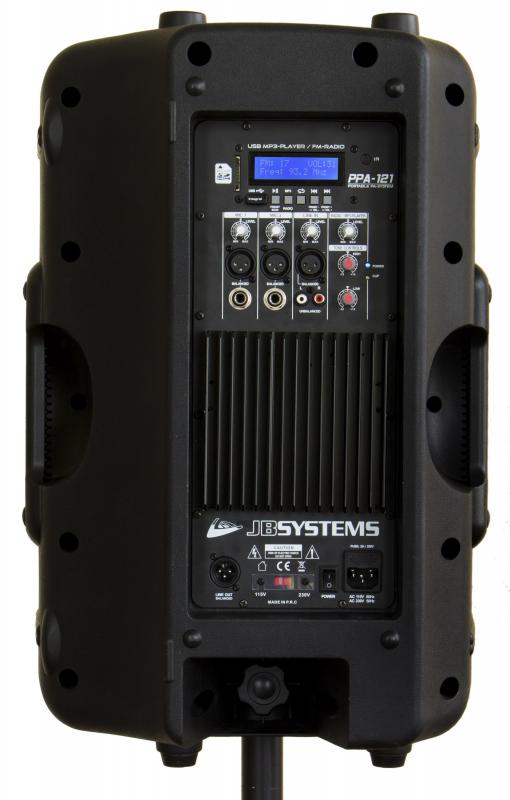 Högtalarlådan är aktiv (integrerad förstärkare) och har en fullfjädrad-mediaspelare, FM-radio och inbyggd mixer.
