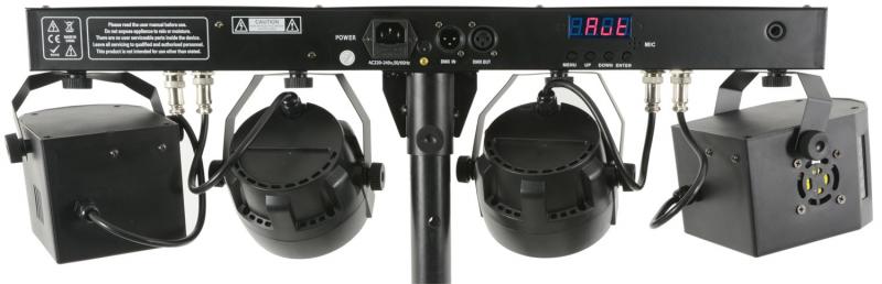 Mobilt ljus set med 2 st PAR armaturer samt 2 st ljudeffekter. Rigga upp denna BAR och du har belysning som fungerar både till scen och dansgolv. Styr den via DMX, den medföljande IR kontrollen eller via interna program som går att köra både i auto läge och musikstyrt.