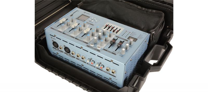 A suitcase style PA set comprising a powered mixer and 2 speakers with tripod stands. The case opens to reveal the mixer and amplifier section, which has 2 balanced microphone inputs, 1 unbalanced mic/line input and a stereo line input channel. There are stereo or mono line outputs and a headphone output in addition to left & right jack speaker outputs. An internal player section is provided for playback of audio files stored on USB or SD media. A DSP section takes care of vocal or musical effects with 16 preset programs. Each side of the case forms a speaker cabinet, which slide out and can be mounted to the 2 included speaker stands. A portable and compact solution for performers, teachers and small meetings.