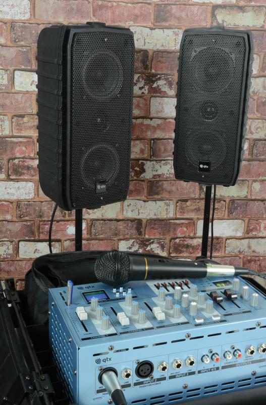 Komplett Mini-PA med högtalare, stativ, mixerbord och mikrofon. Mixern har inbyggd mediaspelare, effekter mm. Perfekt för möten, klassrum, lärare, föreläsare, trubadur spelningar mm.