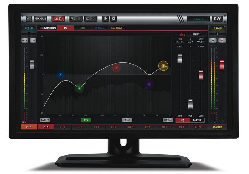 - DigiTech® Amp Modelling and channel view available on the first two Ui mixer channels along with a selectable Hi-Z (high input impedance) selection for sources such as direct-input guitar pick-ups
